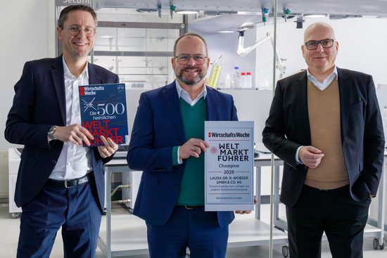 Die LAUDA DR. R. WOBSER GMBH & CO. KG wurde zum zehnten Mal in Folge als Weltmarktführer im Bereich »Temperiergeräte und -anlagen zur exakten Temperaturerzeugung« ausgezeichnet. Der renommierte »Index der Weltmarktführer«, der unter der Leitung von Prof. Dr. Christoph Müller von der Universität St. Gallen, Schweiz, ermittelt wird, bildet die Grundlage für die jährliche Prämierung durch das führende Wirtschaftsmagazin »WirtschaftsWoche«.