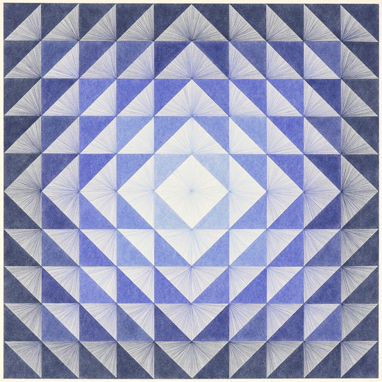 Christiane Kaufmann entwickelt dieses Prinzip in ihren Zeichnungen weiter und erkundet das Spannungsfeld zwischen Punkt, Linie und Fläche, zwischen mathematisch strenger Ordnung und vibrierender Lebendigkeit. Durch die stete Wiederholung handgezogener, gerader Linien aus einem Punkt heraus erfasst sie den meditativ-zeitlichen Aspekt des Zeichenprozesses. Jede der Linien ähnelt der vorangegangenen, ist jedoch niemals eine perfekte Kopie. So wird der konkret-konstruktiven Ordnung eine menschliche Variation eingeschrieben, die den Arbeiten ihre besondere Präsenz verleiht.