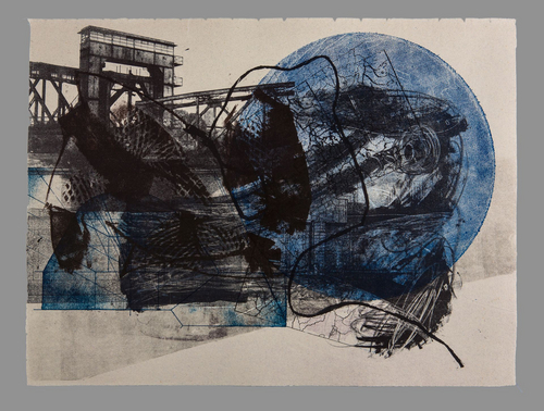 »Brückenbau«, gedruckt von drei Steinen, einem Stempel und verschiedenen Materialien auf Hadernpapier, Unikat © Angelika Flaig