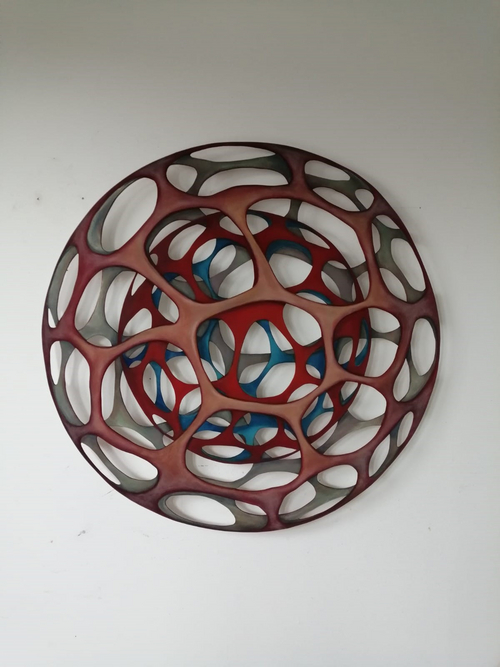 Es sind mehrdimensionale Wandobjekte, die Ute Haecker in ihrem Atelier erschafft. Sie nutzt Stahl oder Holz als Arbeitsmaterialien, bearbeitet sie mit der Säge oder dem Laserschneider und bemalt sie schließlich mit Wachstempera. So komponiert sie Bildräume, die imaginär und real zugleich sind. Es entstehen Wechselspiele zwischen Materialität und Immaterialität, Durchlässigkeit und Abgrenzung, Außenraum und Innenraum. »Bewegt sich der Betrachter auf das Bildobjekt zu, macht er seine eigenen Erfahrungen von Irritation, Imagination und Verwandlung«, sagt Ute Haecker über die Wirkungsweise ihrer Arbeiten. Bis heute fordert sich die Künstlerin immer wieder heraus, diese Imaginationsräume zu zeigen, den Betrachter einzuladen, genau hinzuschauen, um dieses Vor und Zurück, das Hin und Her von Wirklichkeit und Illusion selbst zu erfahren. Inspiration für diese scheinbar im Raum schwebenden Strukturen findet sie in der Natur, zum Beispiel in der Mikrobiologie oder der Formenwelt des ozeanischen Mikrokosmos.