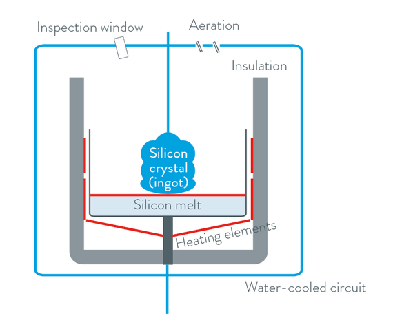 The Czochralski process is an established method for manufacturing wafers, whereby silicon is melted in a crucible and a high-purity single crystal is slowly removed as the material solidifies again. The drawing rod is drawn upwards at a controlled speed of 0.5 - 2 mm per minute, while the molten silicon solidifies at a temperature of 1,410 - 1,420 °C due to undercooling at the interface that forms. By precisely varying the pulling speed and temperature, the growing crystal reaches the desired diameter. Constant temperature control is required throughout the entire pulling process, which can take up to three days. Using water as the temperature control medium to counter-cool reactor heat. With precisely controlled cooling rates, LAUDA supports in minimizing crystal defects in order to maximize ingot quality. The reliability of LAUDA recirculating chillers is of great importance for continuous operation. The TCU components are designed for longevity which means low downtime for the user.