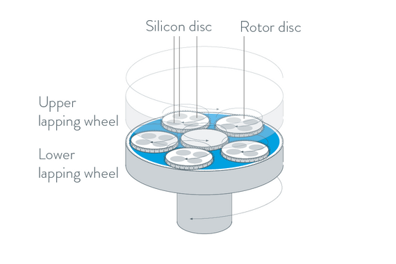 A flawless wafer finish is achieved using lapping and polishing processes that remove irregularities and damage that could affect conductivity. Here, precision temperature control technology is also indispensable in preventing thermal stresses and ensuring consistent material properties. Since the polishing process generates heat and temperature fluctuations affect the removal rate, it is important to maintain a constant temperature at the interface between the pad and wafer. This is achieved by actively controlling the temperature of the lapping wheel.