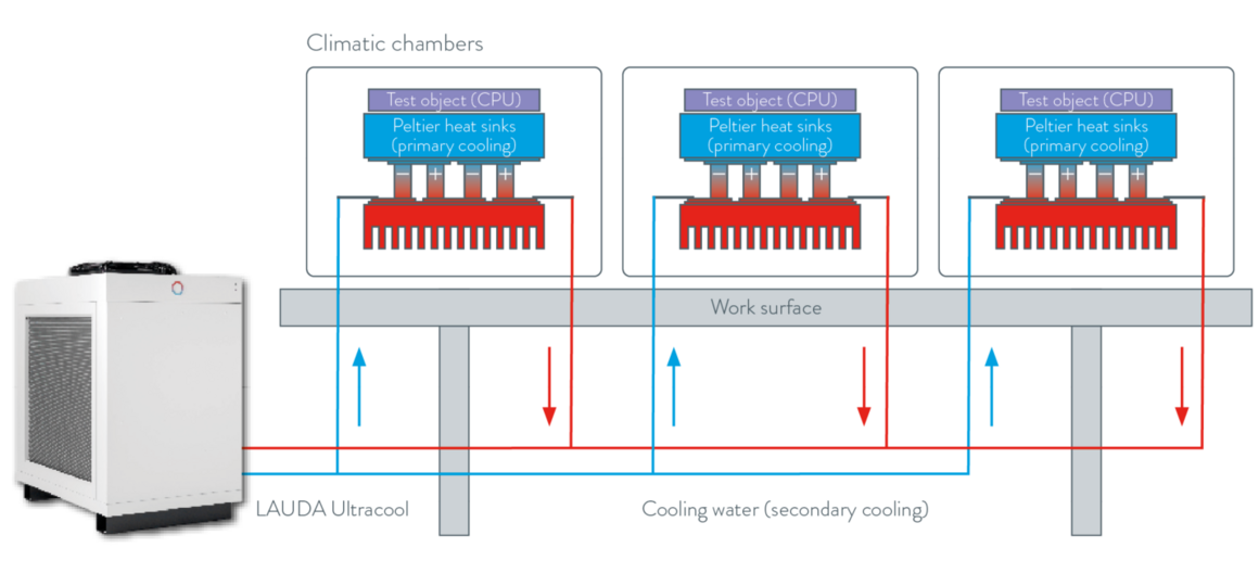 which is essential for the production of meaningful test results. In order to counter-cool these primary cooling units, air-cooled circulation chillers are used as secondary cooling units for multiple climate chambers. These systems provide the necessary cooling water and ensure that the test conditions remain stable over long periods of time. The high reliability and durability of the LAUDA circulation chillers are crucial in ensuring that the test procedures run smoothly.