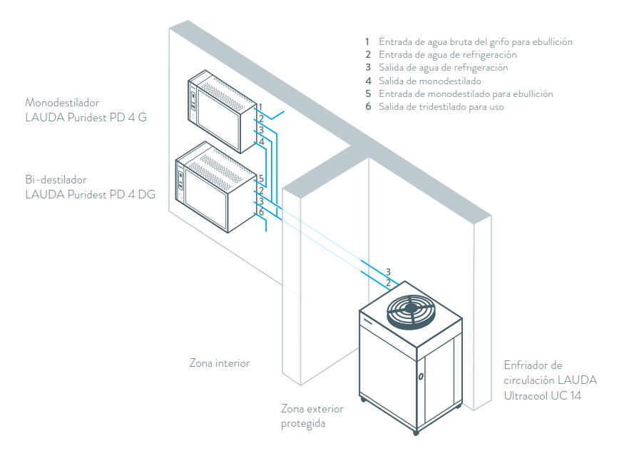 Un destilador de una etapa LAUDA Puridest PD 4 G fabricado en vidrio se encarga de la primera etapa de destilación para la prepurificación y elimina las impurezas del agua del manantial. Una unidad de dos etapas LAUDA Puridest PD 4 DG fabricada en vidrio procesa luego el agua purificada y se encarga de la segunda y tercera etapas de destilación. De esta manera, el cliente recibe agua triplemente destilada de la más alta pureza, al mismo tiempo que puede obtener agua destilada simple por separado del primer dispositivo Puridest en cualquier momento para otros fines. Ambos dispositivos están montados en la pared para ahorrar espacio.