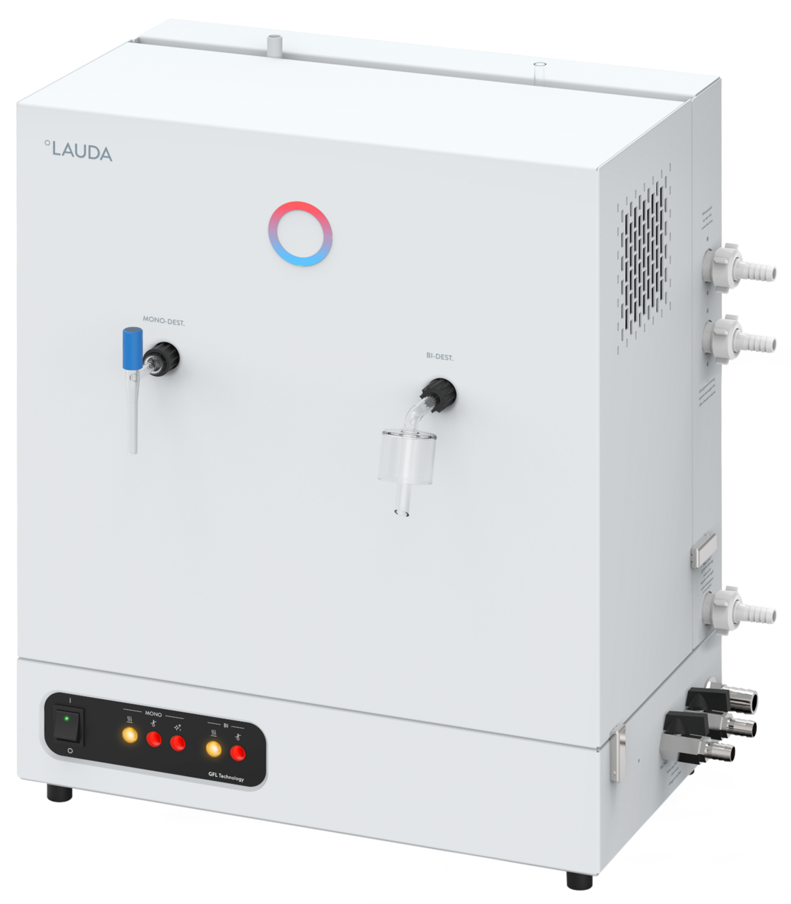 Commutateur central et alarmes lumineuses de surveillance des deux étages de distillation en face avant de l´appareil