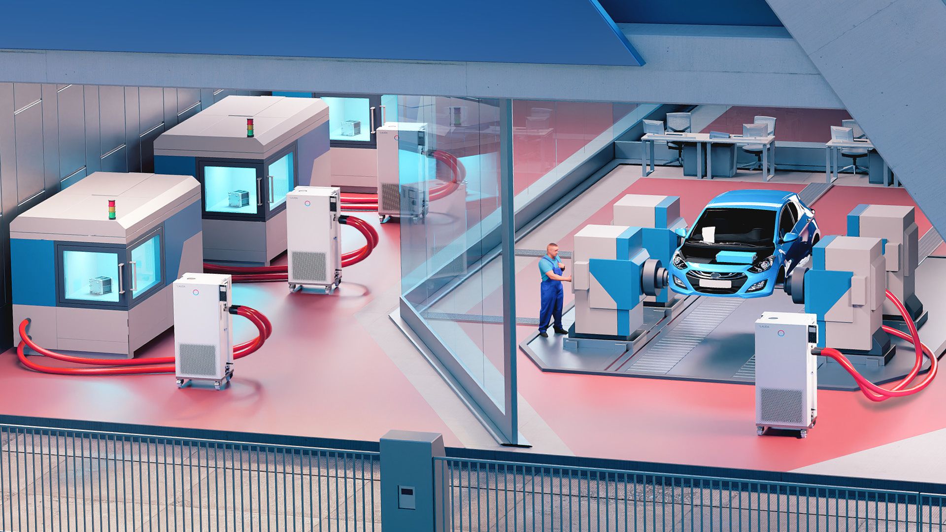 In the automotive industry, temperature control is mainly found in test and inspection rigs, as well as material tests. All the components of an automobile are exposed to extremely high temperature fluctuations to ensure that they function correctly and reliably during subsequent use. This process of testing many different components in special test rigs makes an important contribution to increasing quality and reliability. The simulation of extreme environmental conditions across a wide range of different temperatures is an important part of the material tests. Climatic chambers are used to simulate ambient temperatures, while process thermostats control the temperature of the coolant to simulate cooling circuits in the vehicle. The heat flow in the test specimen can be controlled via temperature gradients as a result.