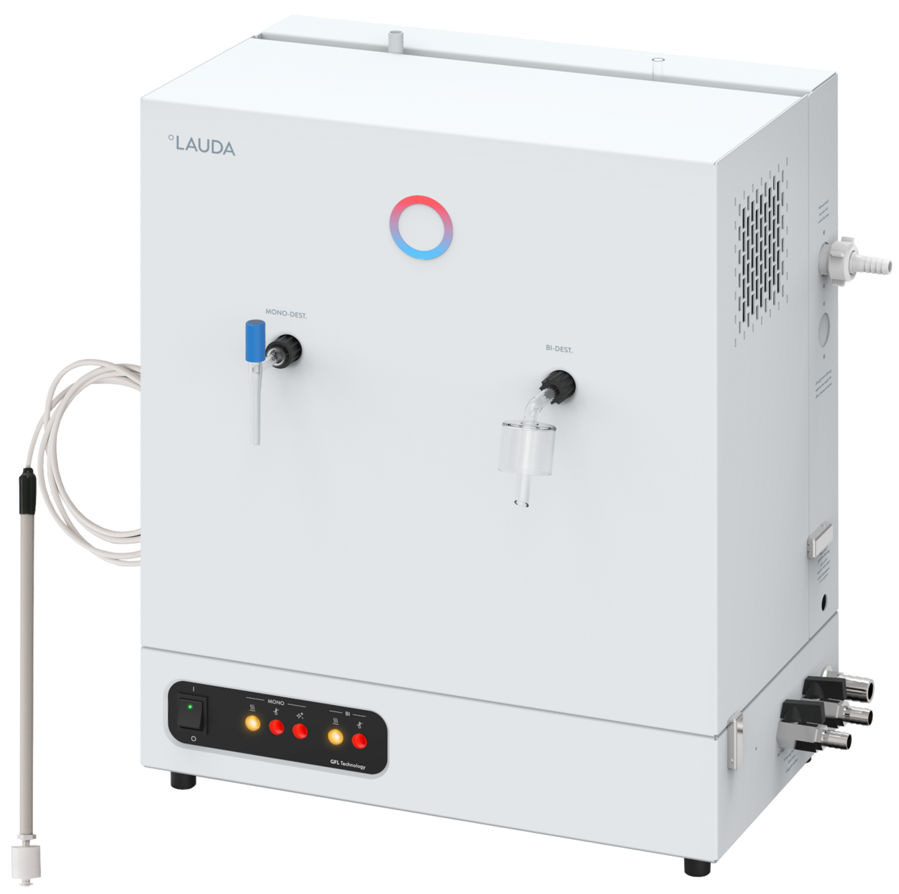 Main switch with pilot lamp for the monitoring of both distillation stages at the front of the unit